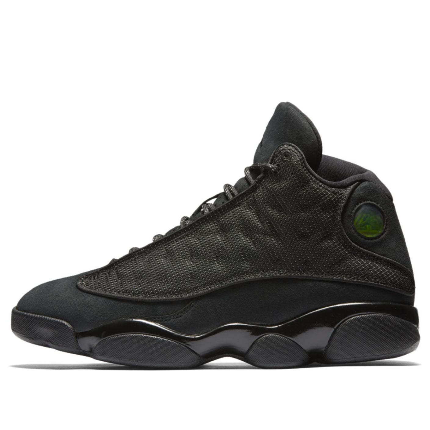 The Air Jordan 13 Retro 'Black Cat' is a sleek and stylish sneaker that is sure to turn heads. Its monochromatic black finish plays off one of Michael Jordan's many nicknames, and its holographic cat eye and reflective detailing add an extra touch of pizzazz. The glossy finish on the Phylon midsole is the perfect finishing touch, and the sneaker's signature panther paw outsole provides maximum grip.